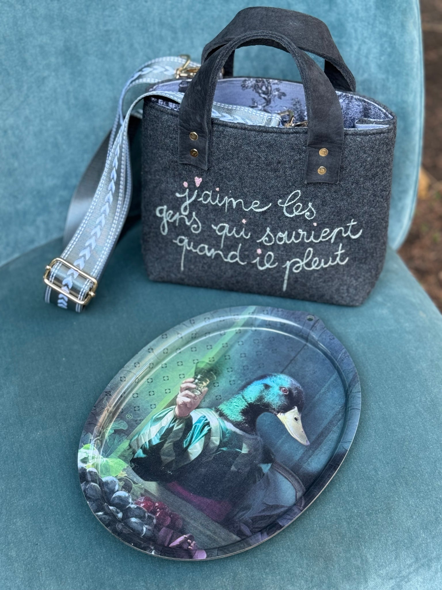 Discover the artistry and uniqueness of the J' aime les gens Mini Soft Tote. Handcrafted with original fabrics from well-known manufacturers and detailed embroidery, each piece is truly one-of-a-kind. The repurposed leather handle and coordinated fabric strap add to its charm. Handmade with care, dimensions may vary slightly. 21 x 9 x 16cm (H).