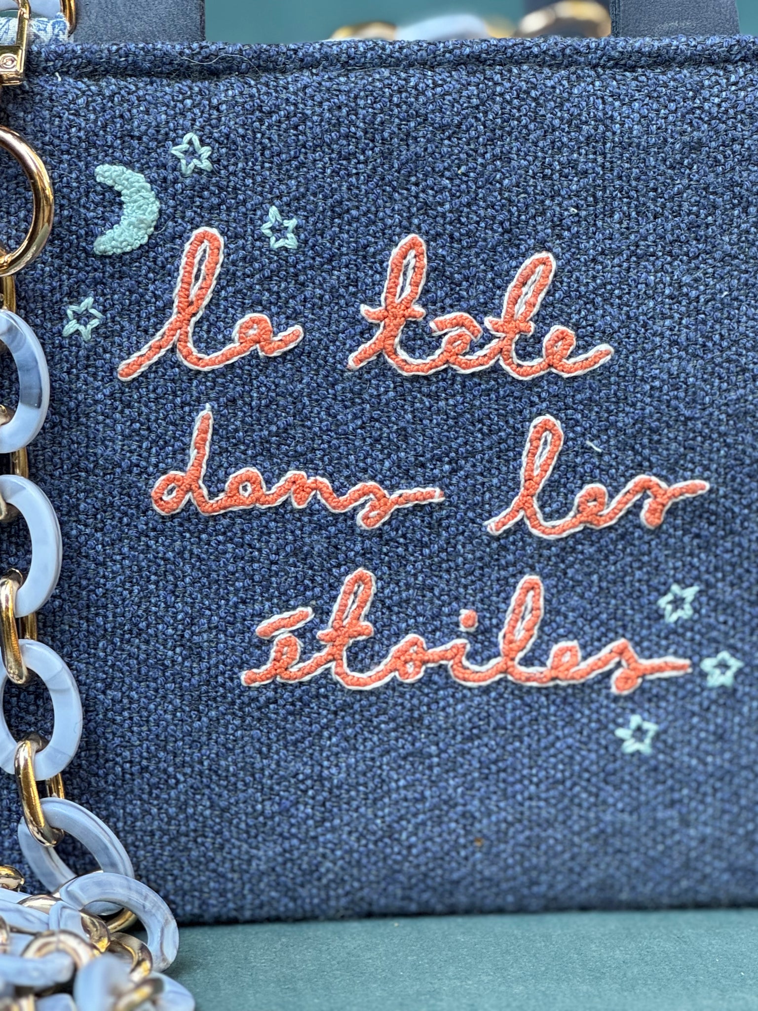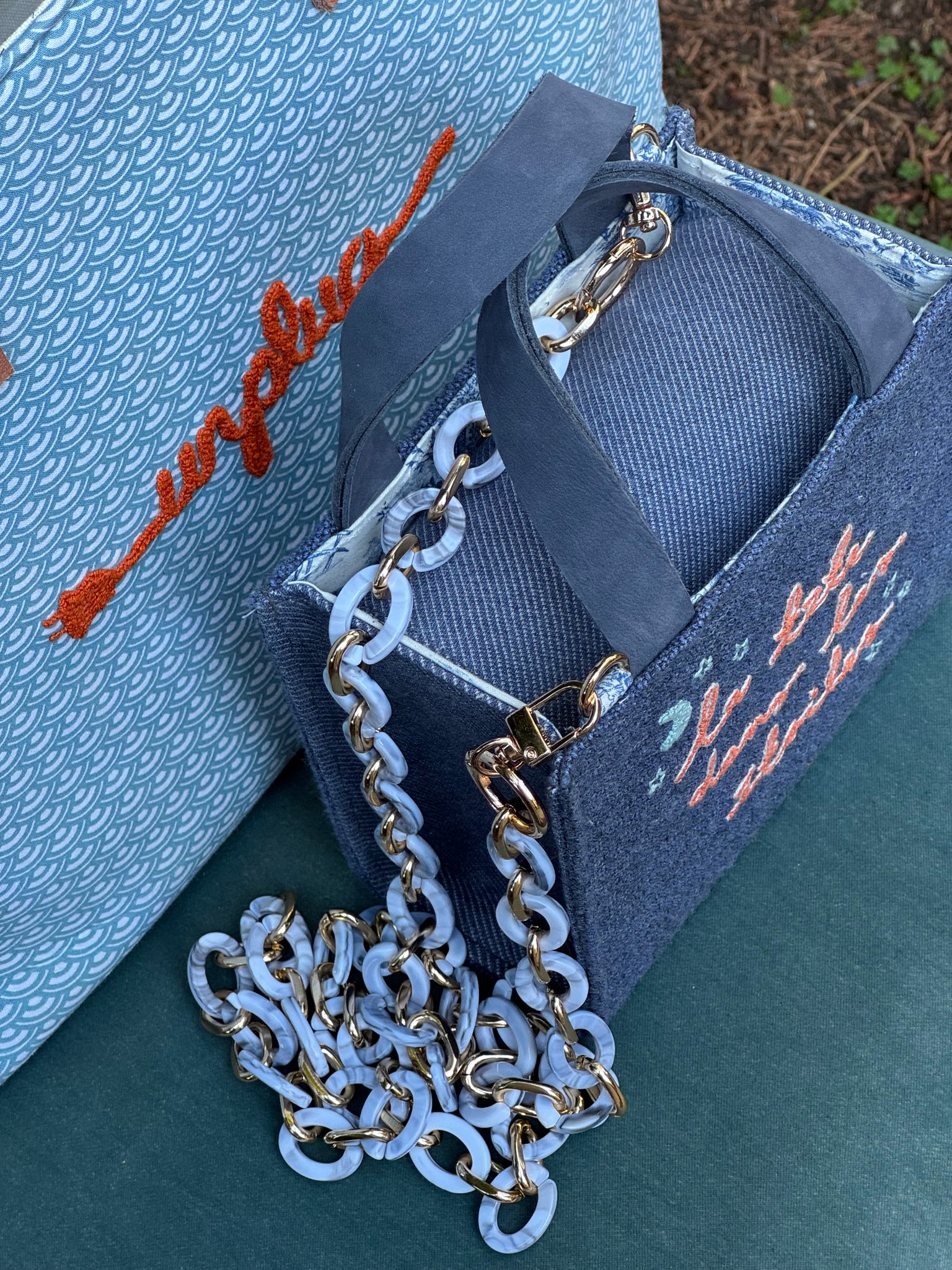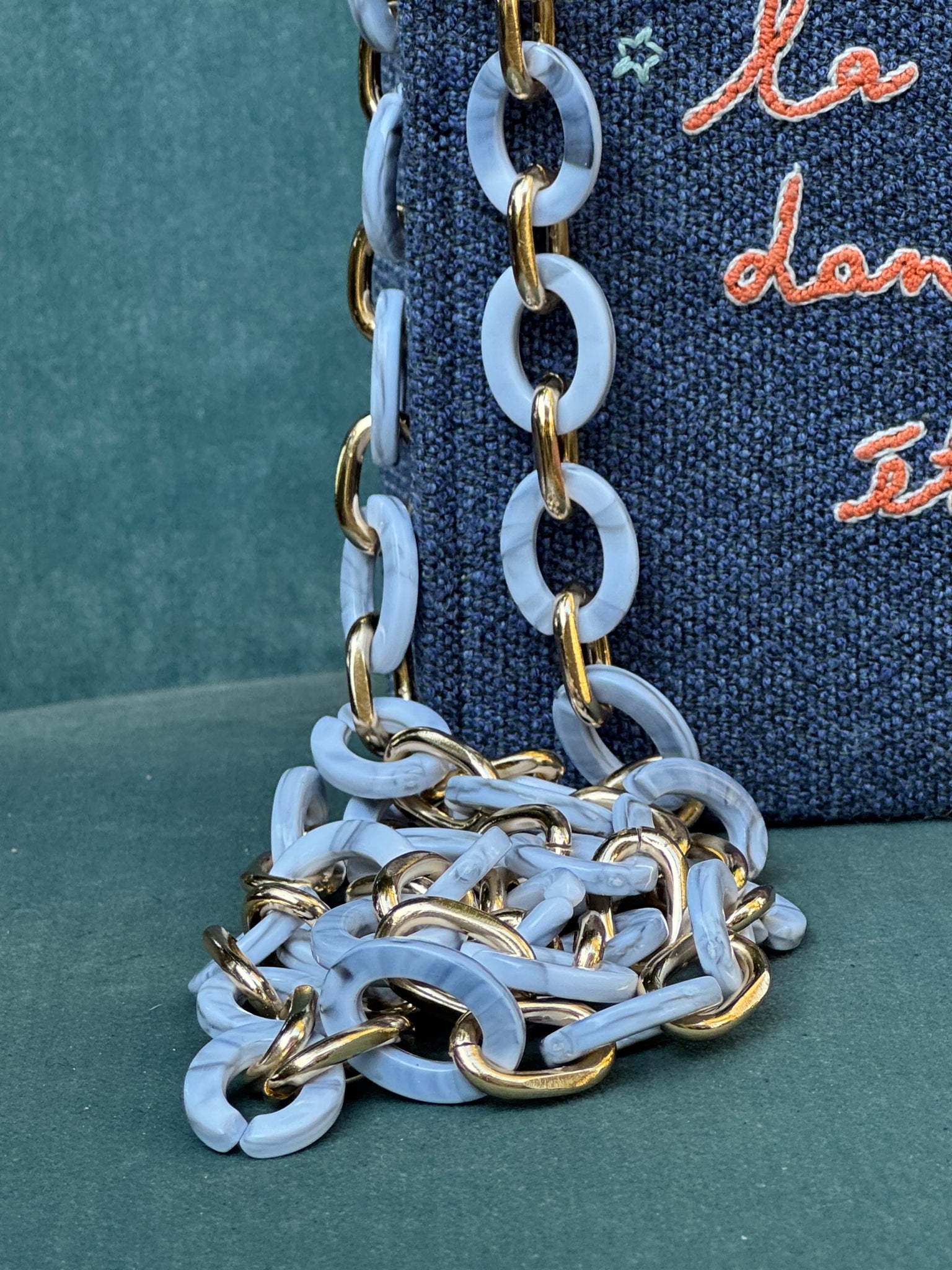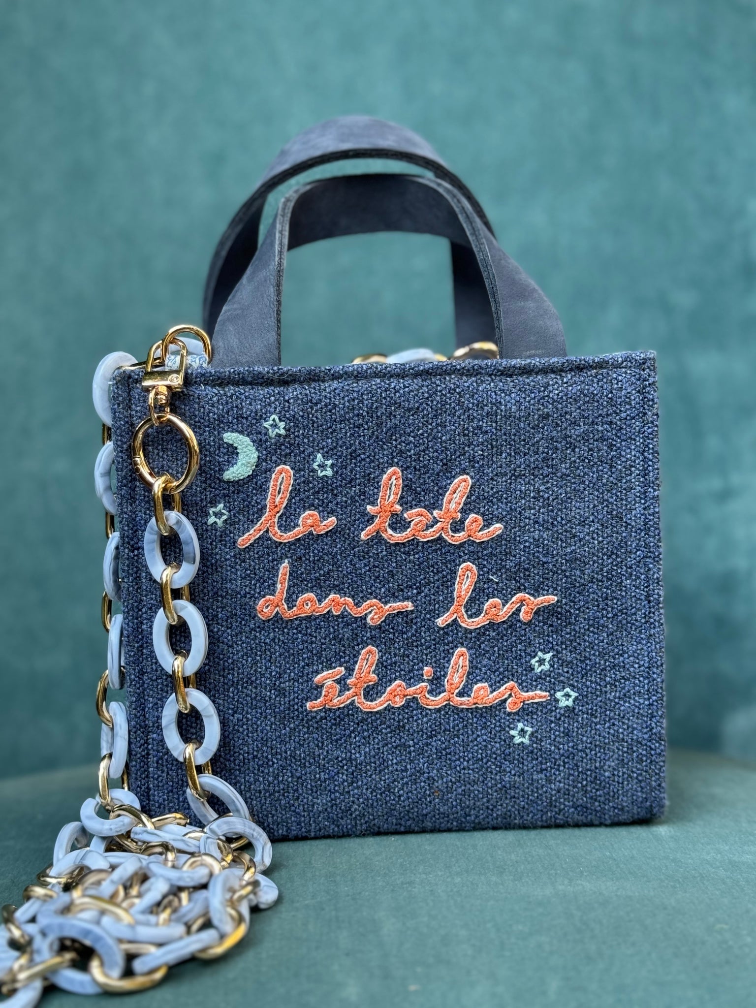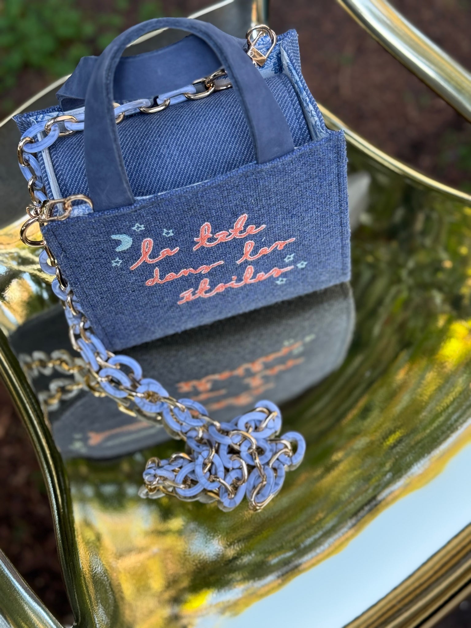 Handcrafted with care, this unique bag features original fabric swatches from well-known manufacturers. Its handmade embroidery and coordinated internal lining make it a standout piece. The repurposed genuine leather handle adds a touch of luxury, while the plastic strap and chain provide versatility. Measures 17 x 15 x 8 cm.